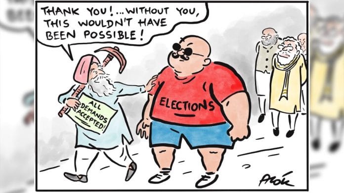 In today’s featured cartoon, Alok Nirantar illustrates a farmer thanking ‘elections’ for the Narendra Modi government agreeing to several pending demands, which has brought their year-long protests on the borders of Delhi to an end.
