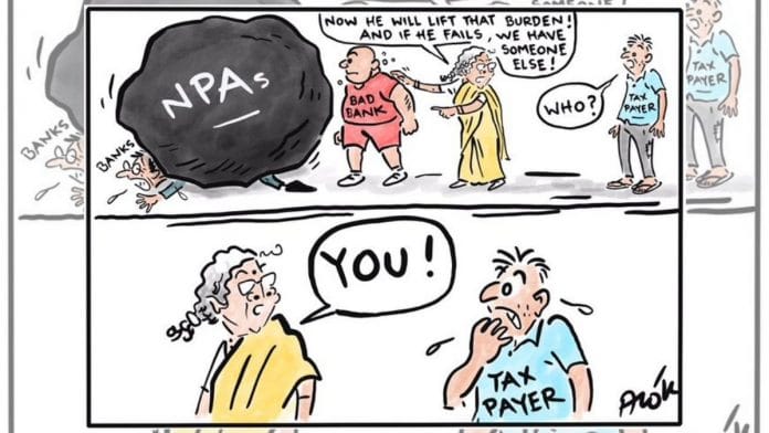 In today’s featured cartoon, Alok Nirantar comments on the Centre’s decision to set up a ‘Bad Bank‘ to offload Rs 2 lakh crore worth of non-performing assets (NPAs) in five years, and suggests the government’s fall-back option is the taxpayer’s money.