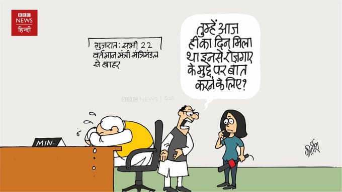 Kirtish Bhatt has a tongue-in-cheek take on ‘Operation Clean‘ — all ministers from former Gujarat CM Vijay Rupani’s cabinet being dropped from the new Bhupendra Patel government. The cartoonist depicts a reporter showing up to ask a minister about unemployment on a day he himself was sacked.