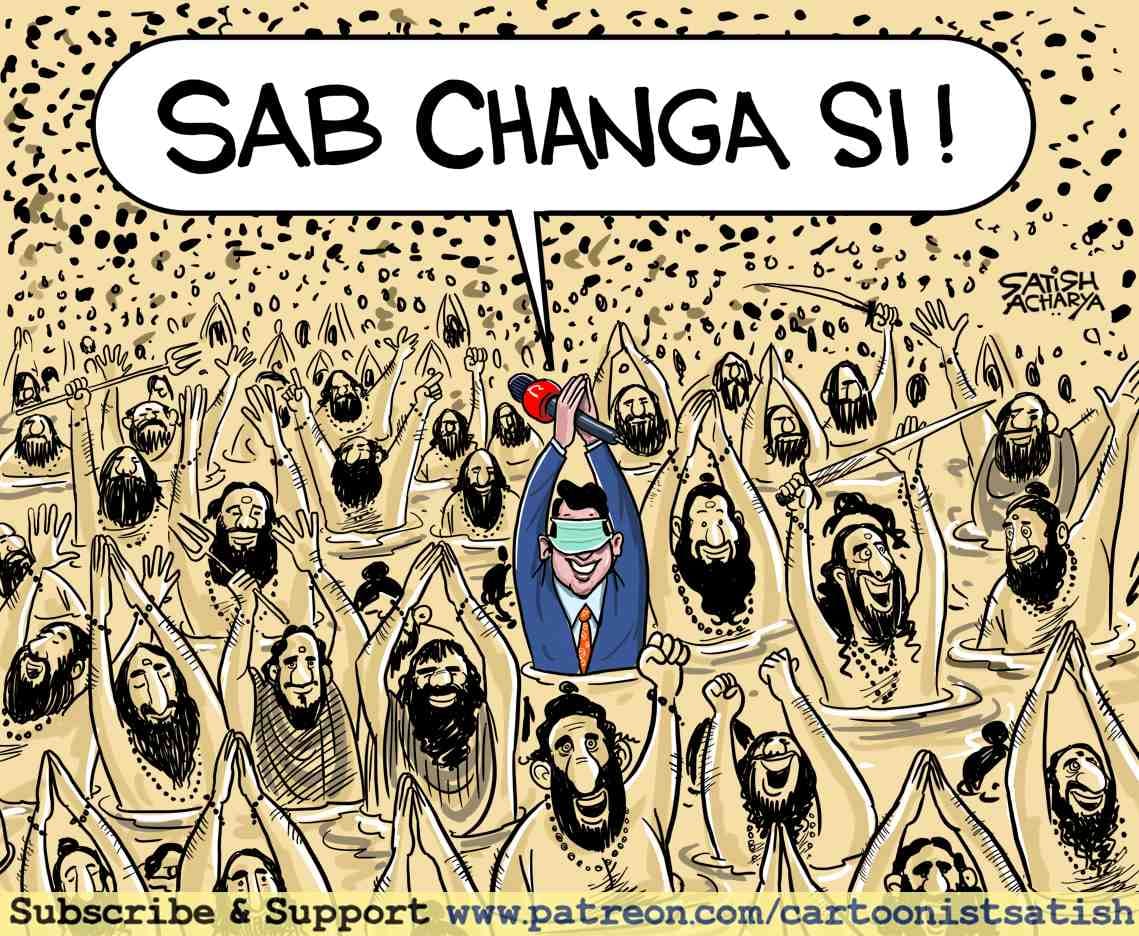 Satish Acharya takes a swipe at the brazen breaking of social distancing norms at the Kumbh Mela in Haridwar, Uttarakhand.