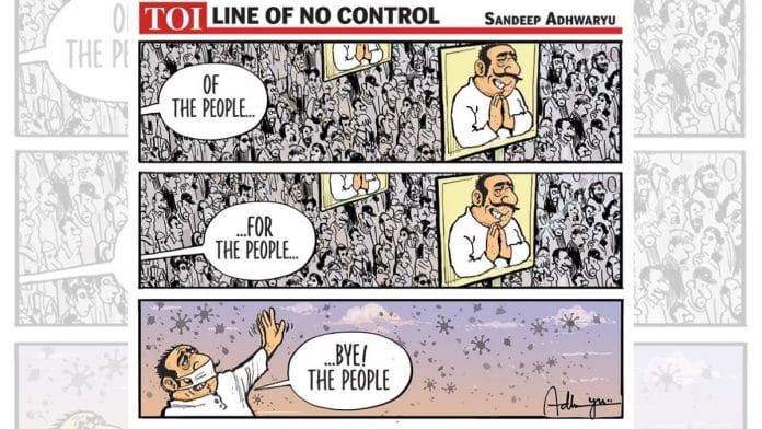In today’s featured cartoon, Sandeep Adhwaryu illustrates the continued flouting of social distancing and other Covid rules at political rallies, amid ongoing assembly elections in several states.