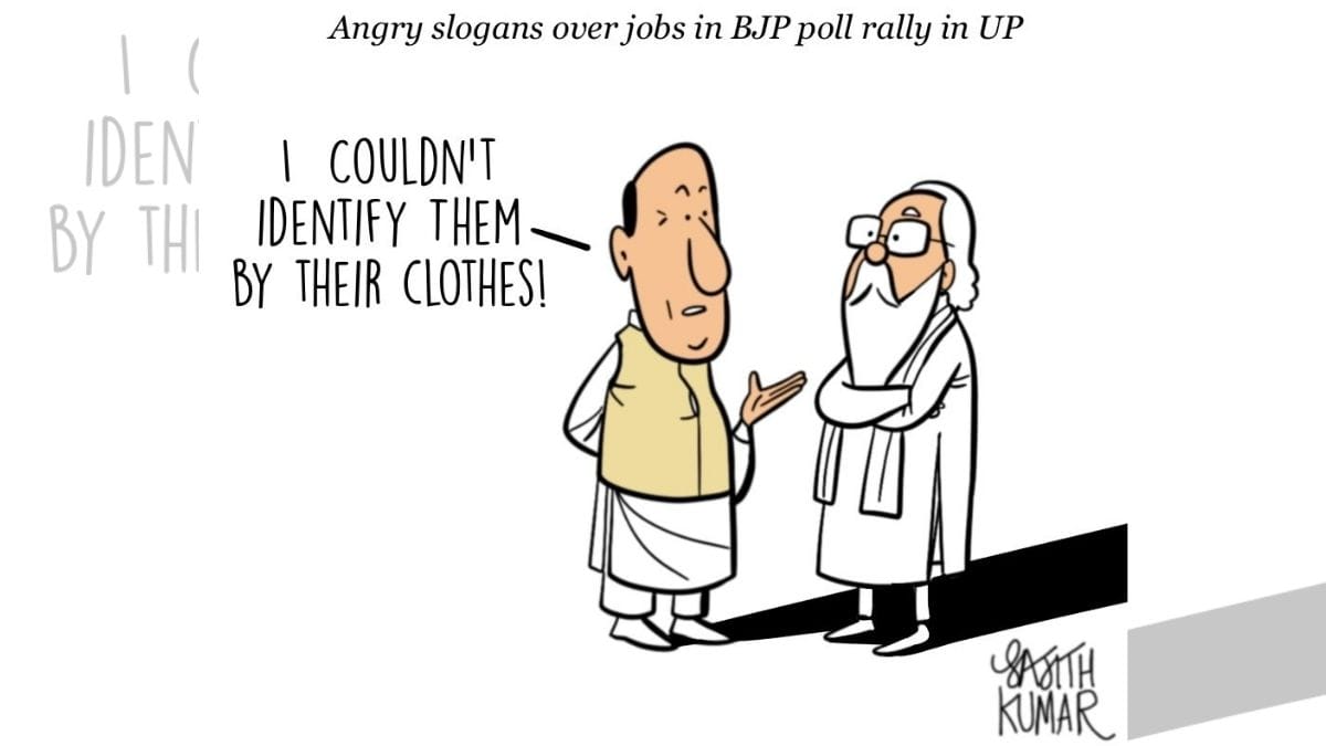 Alluding to Prime Minister Narendra Modi’s comment in 2019 that those indulging in violence during protests against the Citizenship (Amendment) Act could be identified “by their clothes”, Sajith Kumar takes a jibe at the backlash Defence Minister Rajnath Singh faced during a campaign rally in Gonda, Uttar Pradesh. His speech was interrupted by men shouting slogans demanding jobs in the Army.