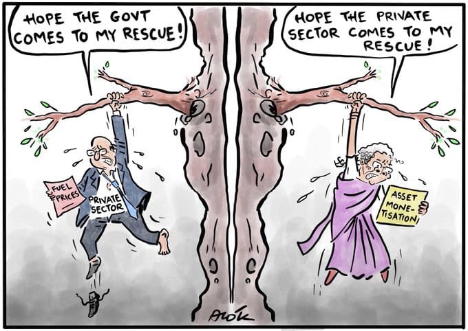 Alok Nirantar illustrates the ironic relationship of the BJP-ruled central government and the private sector.