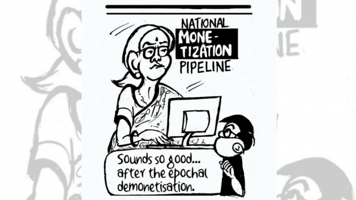 In today’s featured cartoon, E.P. Unny demonstrates a clever wordplay on ‘monetisation’ as Finance Minister Nirmala Sitharaman recently launched the national monetisation pipeline (NMP) which is expected to fetch approximately Rs 6 lakh crore revenue to the Modi government over four years.
