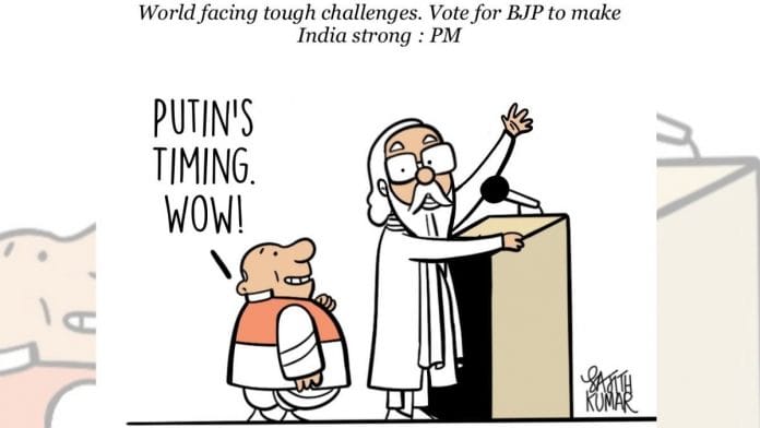 In today’s featured cartoon, Sajith Kumar takes a dig at how Russian President Vladimir Putin’s declaration of war on Ukraine has coincided with assembly elections in India. At election rallies, Prime Minister Narendra Modi has repeatedly referred to his government’s evacuation of Indian nationals from the warzone.