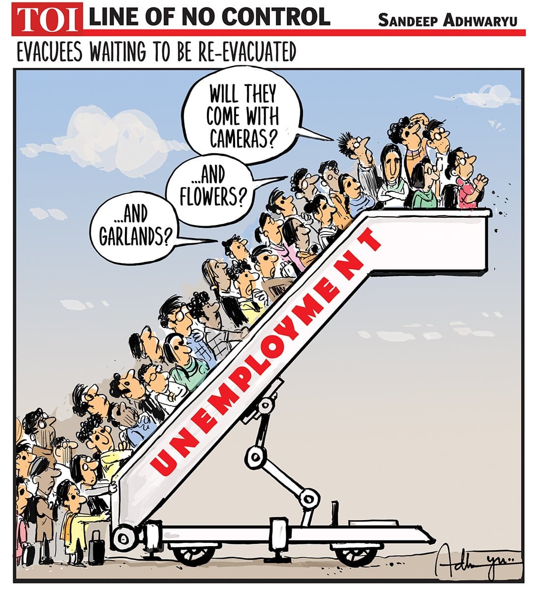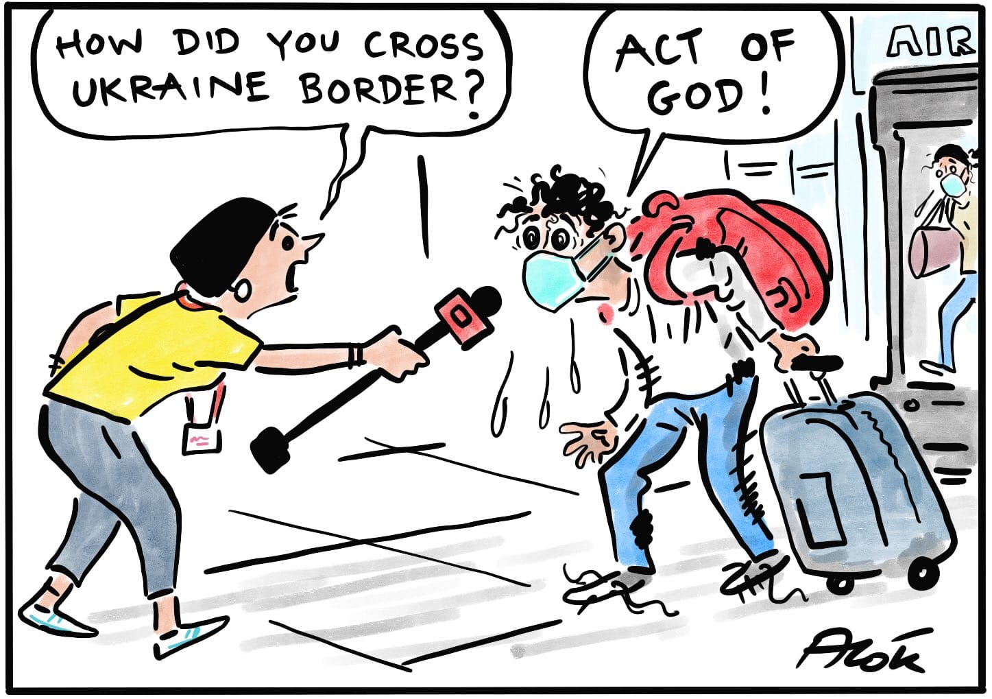 Taking a dig at finance minister Nirmala Sitharaman’s comment in 2020 that the pandemic was an “act of God“, Alok Nirantar illustrates the harrowing experience of Indian students returning from Ukraine amid the Russian invasion after the Indian government asked them to find their own way to neighbouring countries, from where they were evacuated.