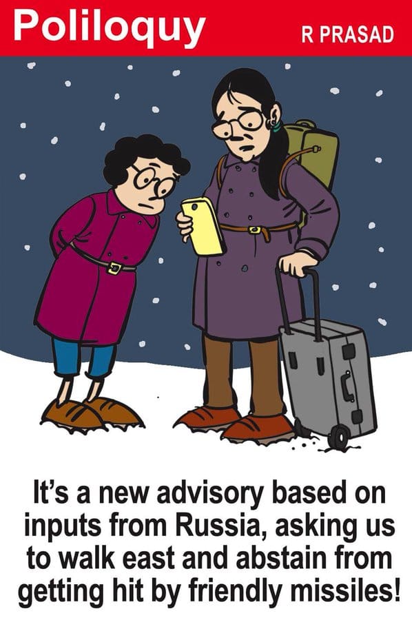 R Prasad takes a swipe at the irony of India getting help from Russia to evacuate its nationals from Ukraine, on which Russia itself has declared war.