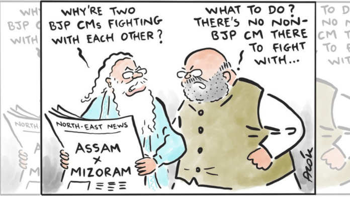 In today’s featured cartoon, Alok Nirantar highlights the long-standing border dispute between the BJP-ruled states of Assam and Mizoram in the Northeast. The old boundary dispute came to fore after five Assam Police personnel were killed Monday during violent clashes at a contested border site.