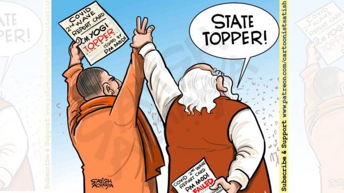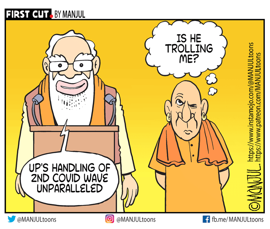 In today’s featured cartoon, Satish Acharya takes a dig at Prime Minister Narendra Modi’s praise for Uttar Pradesh Chief Minister Yogi Adityanath for his “unprecented handling of Covid-19 second wave”.
