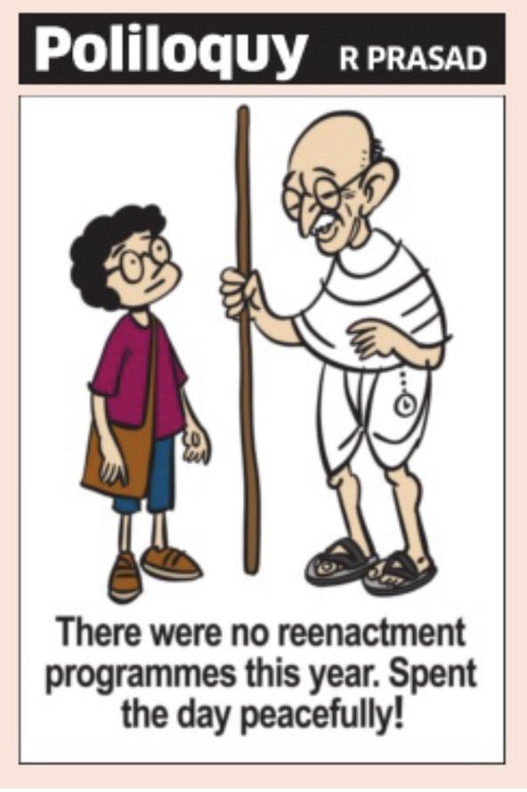R. Prasad shows a relieved Mahatma Gandhi being at peace because this year, unlike in 2019, his death was not ‘reenacted’. In 2019, members of the Hindu Mahasabha had allegedly tried to recreate and celebrate the assassination of Gandhiji.
