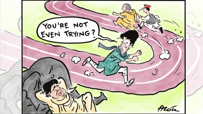In today’s featured cartoon, Alok Nirantar highlights Bahujan Samaj Party (BSP) chief Mayawati’s absence from election campaigning for the UP assembly polls. Nirantar shows a sleeping Mayawati cradled by the trunk of the BSP’s symbol elephant, as competitors Yogi Adityanath of the BJP, Akhilesh Yadav of the SP and a trailing Priyanka Gandhi Vadra of the Congress race past her.