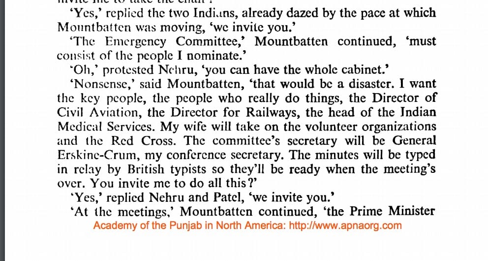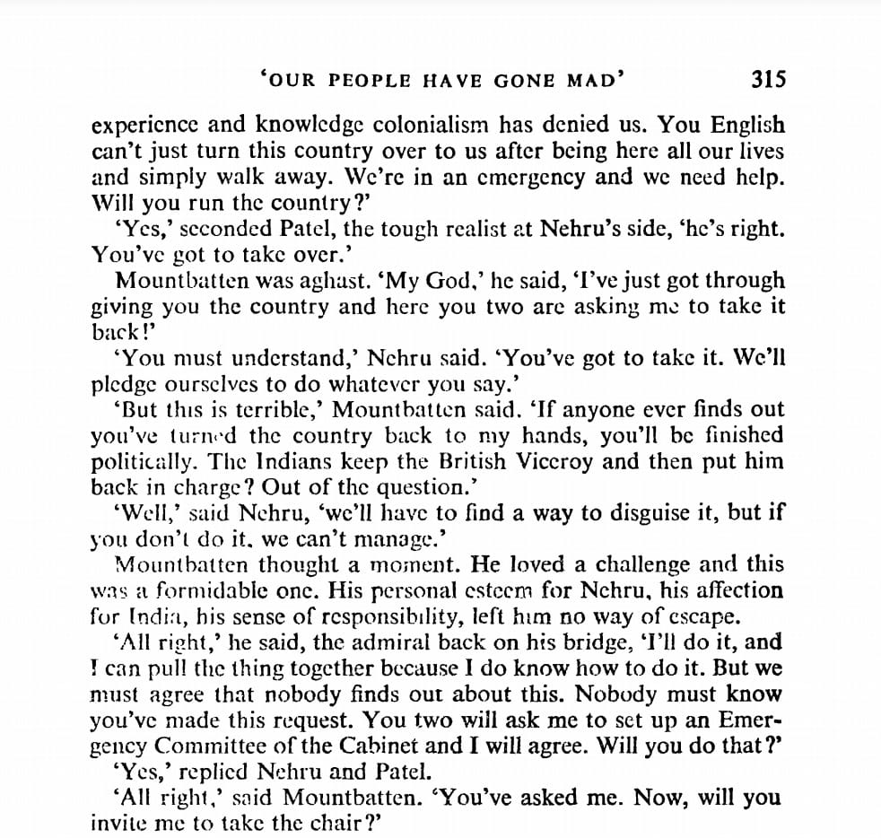 In their Freedom At Midnight, Dominique Lapierre and Larry Collins document a remarkable event. As Partition riots went out of control and the fire burning Punjab reached Delhi, Nehru met Viceroy Mountbatten, and asked for help. He, along with a key lieutenant, told him, they were not yet trained in governance, but agitation, and had spent years in their jails instead. They requested Mountbatten to constitute an emergency council and head it. The viceroy in charge, in a newly independent country.