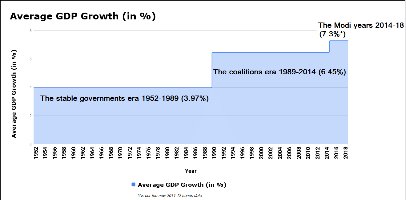 Surprised that analysts have been finding virtues in coalition govts. Short lived govts – be it first Janata govt which had politicians of sll hues had no agenda except anti indira gandhi/ anti emergency or vp singh who brought all opposition together on corruption plank messed up with his mandal politics only to hold on to power ,with Chandrasekhar to I k gujral barring PVNR govt though minority but still kept on to liberal agenda for country’s survival , had their pitfalls. Modi govt has been decisive to carry forward reforms like – gst , demonetisation ( unsuccessful as it May appear has brought to focus corruption ) , smd many progressive programmes which no past govt could bring . With bsnk problems shown GDP of average 7% is noteworthy. You have to compare with immideate preceding years.