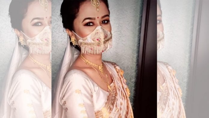 New Delhi: A photograph of an Assamese bride with a fashionably-designed face mask has been garnering praise on social media. The embellished silk handloom cover matched her bridal trousseau, turning the face mask into a chic accessory.