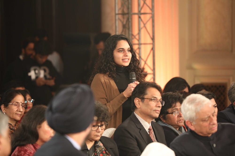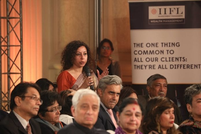 From left: A guest participates in the discussion while retired diplomat K.V. Rajan and Geeta Rajan look on.