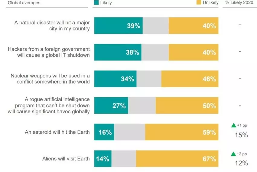 Meanwhile, 39% of people say they expect a natural disaster to affect a city in their country, 38% thought hackers from a foreign power might bring down their IT systems, 34% thought nuclear weapons might be used and 27% feared rogue artificial intelligence.