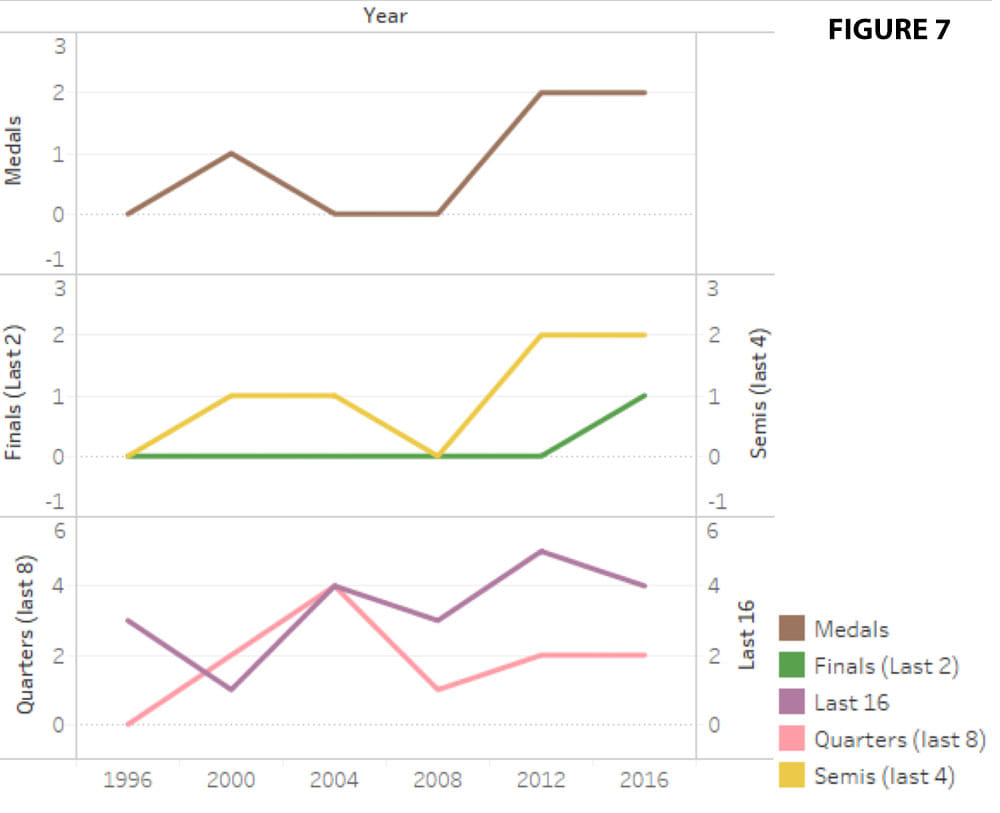 3. Women finishing with medals or in top four positions has increased with Rio being the best so far [Figure 7]. Number of women participants finishing in last eight and 16 has also increased over the years.