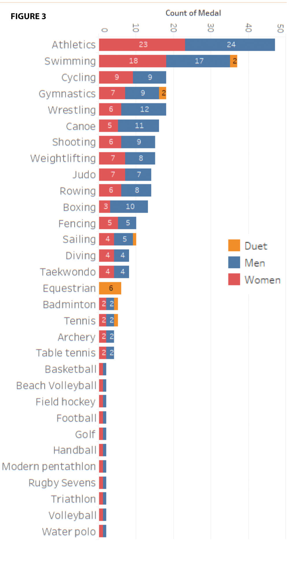 It is interesting to note that there are six sports (athletics, swimming, cycling, gymnastics, wrestling, and canoeing), which account for 50 per cent of medals at stake. Additionally, the top five sports for men are – athletics, swimming, wrestling, canoeing, and boxing, and for women are – athletics, swimming, cycling, gymnastics, and judo [Figure 3].