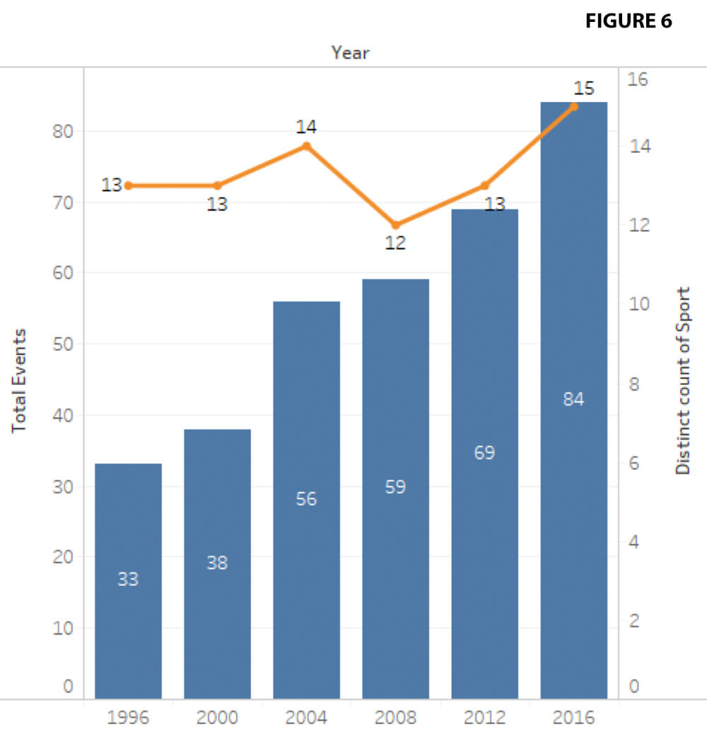 - From 33 events across 13 sports in 1996 [Figure 6], India has progressed to participating in 84 events across 15 sports disciplines in 2016 (highest for India). Women are giving a tough competition to their male counterparts too. In fact, women’s participation has increased from two sports in 1996 to 12 in 2016 – in line with the global trend. Women in wrestling, golf and gymnastics are the latest additions.
