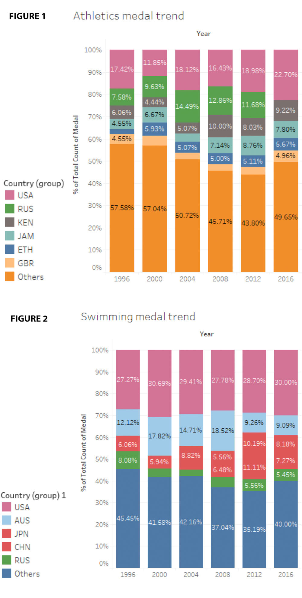 Across editions of Olympics, five-six countries win more than 50 per cent of the medals. The best-performing countries in athletics are the US, Russia, Kenya, Jamaica, Ethiopia and Great Britain [Figure 1], while those in swimming are the US, Australia, Japan, China, and Russia [Figure 2].