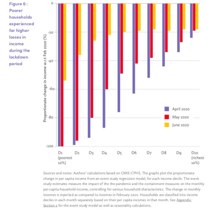 Fourth, recovery must begin from below. The pandemic, like any other natural or human-made calamity, affects the poorest first. We know the story from one end, of the rise of corporate and super-rich income during the pandemic. The Azim Premji University report presents the story from the other end: The bottom 10 per cent families lost their entire income for the month of April and May last year, while the loss for the top 10 per cent families was just about one-fifth of their earlier income (Figure 6).