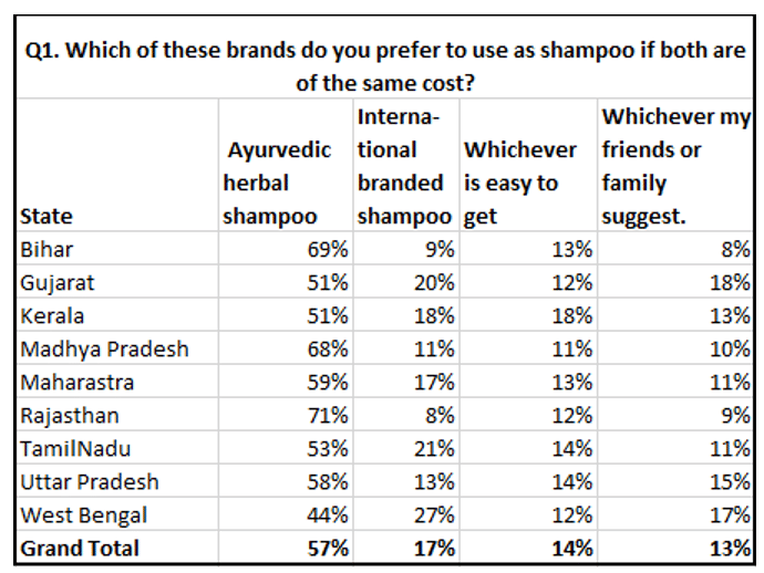 Has India now changed considerably? Do most Indians prefer ayurvedic herbal products over the West acclaimed and proven brands? Prashnam decided to find out. We posed an innocuous question: which shampoo would urban Indians prefer if they are all the same cost? We wanted to know if there is a natural preference to Indian ayurvedic herbal brands or do people prefer international brands.