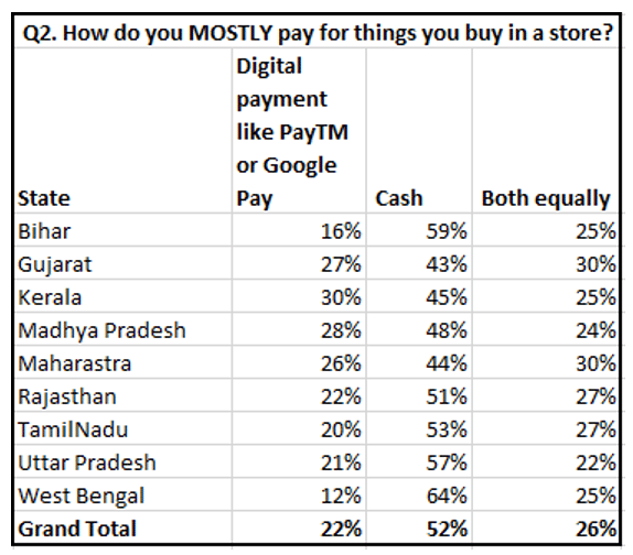 Fifty-two per cent of the respondents prefer to pay in cash but at the same time, there also seems to be a shift to modern digital modes of payment for purchases. A sizeable share — of more than 30 per cent (22 per cent plus half of 26 per cent) say they use digital payment methods to pay for their purchases.