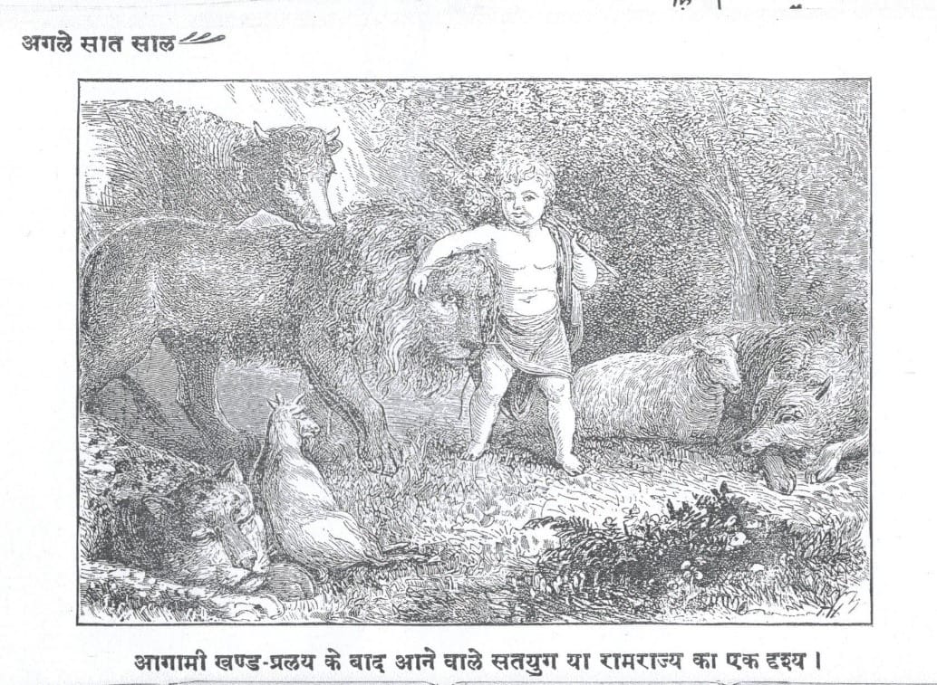 Drawing from Hindu idioms, the first page of Agle Sat Sal had a picture of a child playing with a lion, and other animals sleeping nearby. The title of the picture stated: Agami khand-pralay ke baad aane wale satyug ya ram rajya ka ek drishya (A view of satyug or Ram Rajya coming after the ensuing catastrophe).