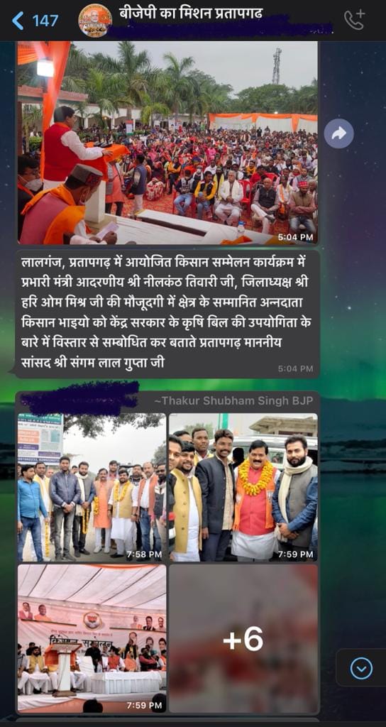 On a BJP WhatsApp group in Pratapgarh, Uttar Pradesh, I see an image of a public meeting organised by the party’s local unit. A UP government minister, Neelkanth Tiwari, and Pratapgarh MP Sangam Lal Gupta are addressing it. The audience is described as “the region’s honoured annadata (food providers)”. It looks like an election-time sabha.