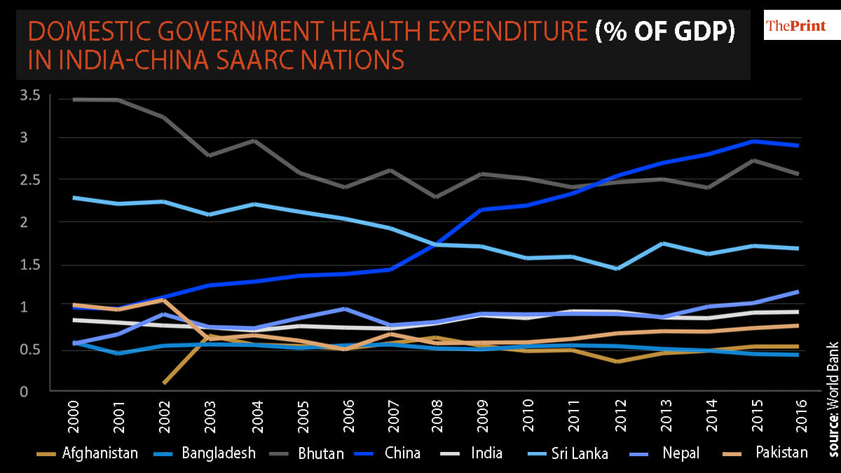 India reports one of the lowest public healthcare spending in proportion to its GDP among the SAARC nations.