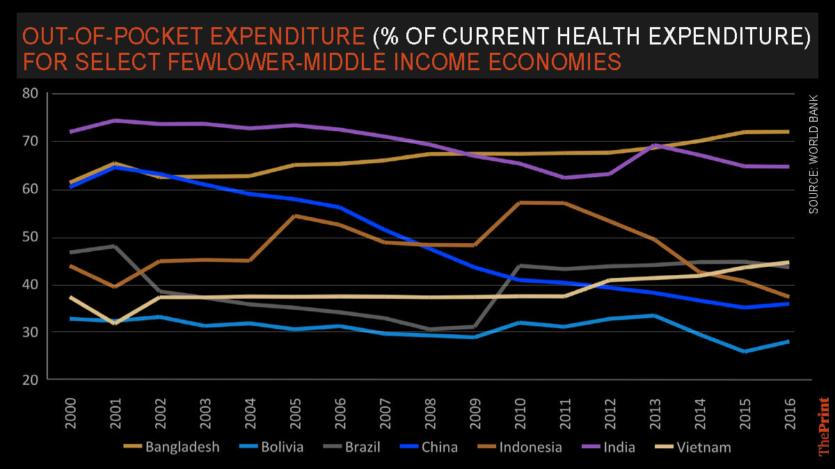 From the citizenry’s perspective, in a system where private healthcare proportion of spending is much higher than the government across states and in urban spaces, the share of out of pocket spending on overall medical cost and expenses by Indians remains higher than most the other developing countries.