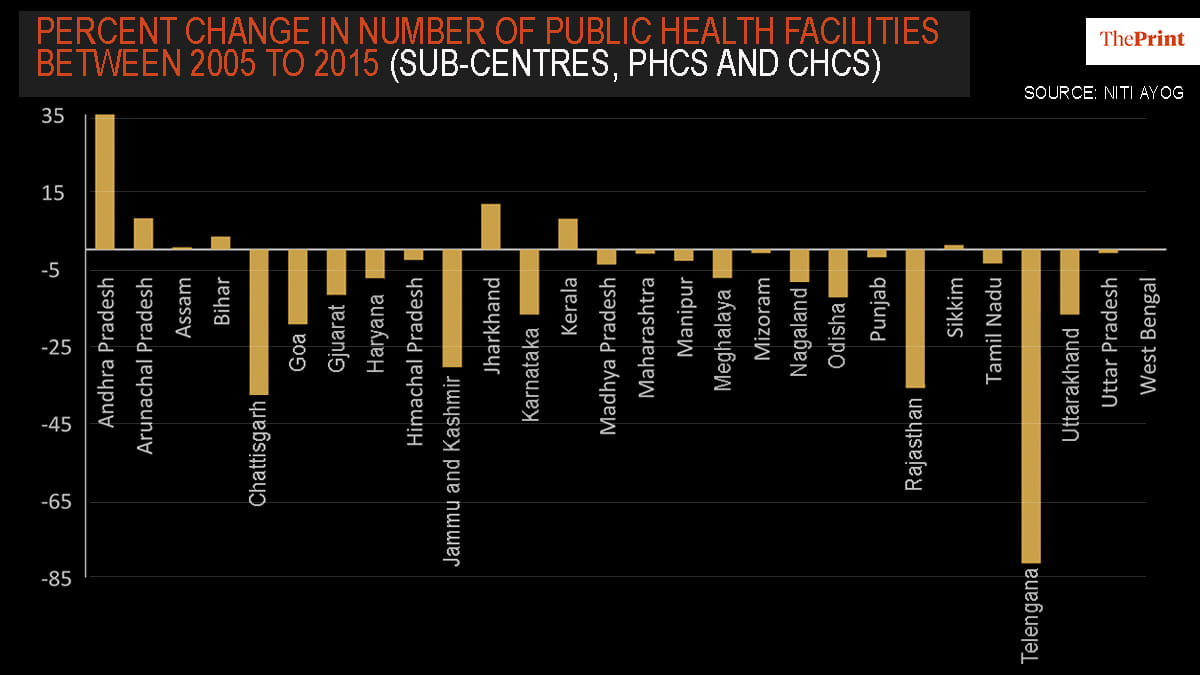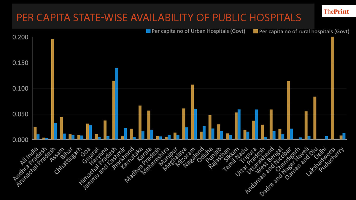 Most states have also seen a significant decline in number of public health facilities over the last decade, except for states like Andhra Pradesh, Jharkhand and Bihar which have increased sub-centres like PHCs, CHCs. There is a massive state-level variation in the number of public hospital beds per capita available within urban-rural areas.
