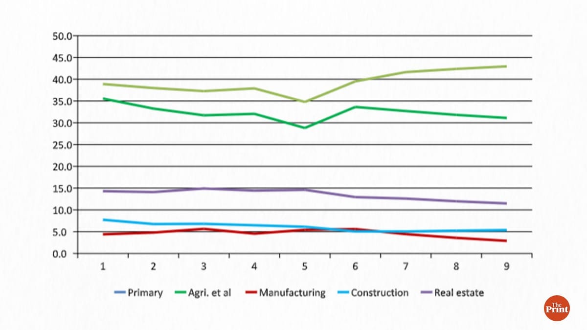 What is the relative contribution of various sectors within the region’s economy? We plot shares of five select sectors in Figure 2. Bundelkhand is predominantly an agrarian economy. According to Census 2011, over two-thirds (70 per cent) of the working-age population are engaged in agricultural activities. This sector contributes to roughly a third of the region’s economy. This share stood at 31 per cent in 2019-20. The divergence between primary sector and agriculture implies that there has been significant growth in mining and quarrying activities in the region in recent years. What could have caused this requires deeper investigation.