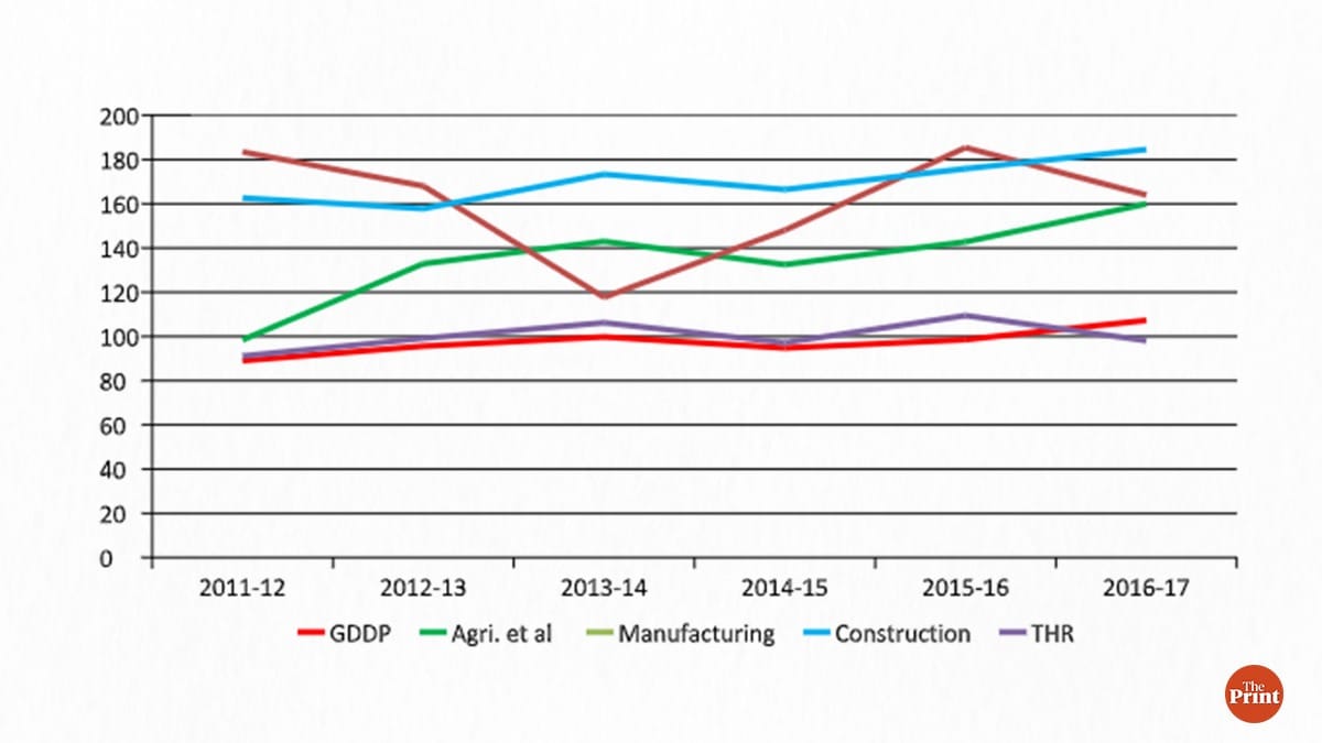 The manufacturing sector — even though contributing a very small proportion to both the regions — is relatively larger in MP-Bundelkhand. The sector has shown large fluctuations over the years. Two other sectors — construction and trade, hotel and restaurant — have grown relatively faster in MP-Bundelkhand.