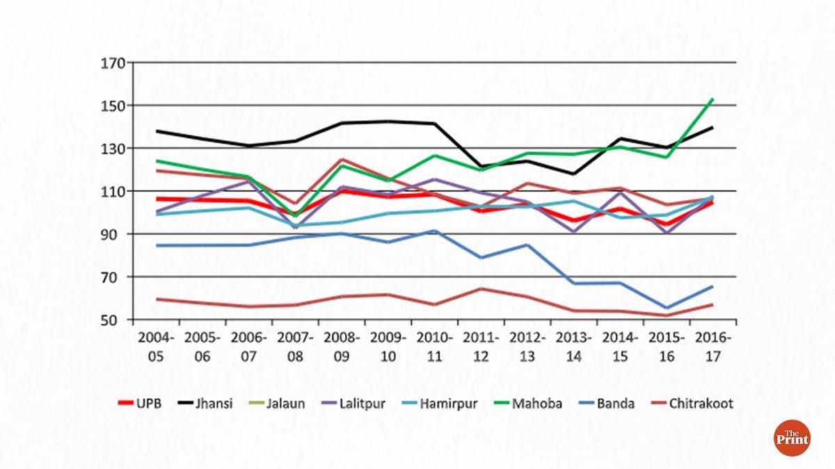 The per capita income of Chitrakoot has been consistently lowest in the region. It is less than two-thirds of Uttar Pradesh’s average. An even worrying aspect is the slow and steady decline since 2011-12. Banda district’s decline is especially worrisome, falling from 85 per cent in 2011-12 to just 65 per cent in 2016-17, largely due to the performance of the primary sector.