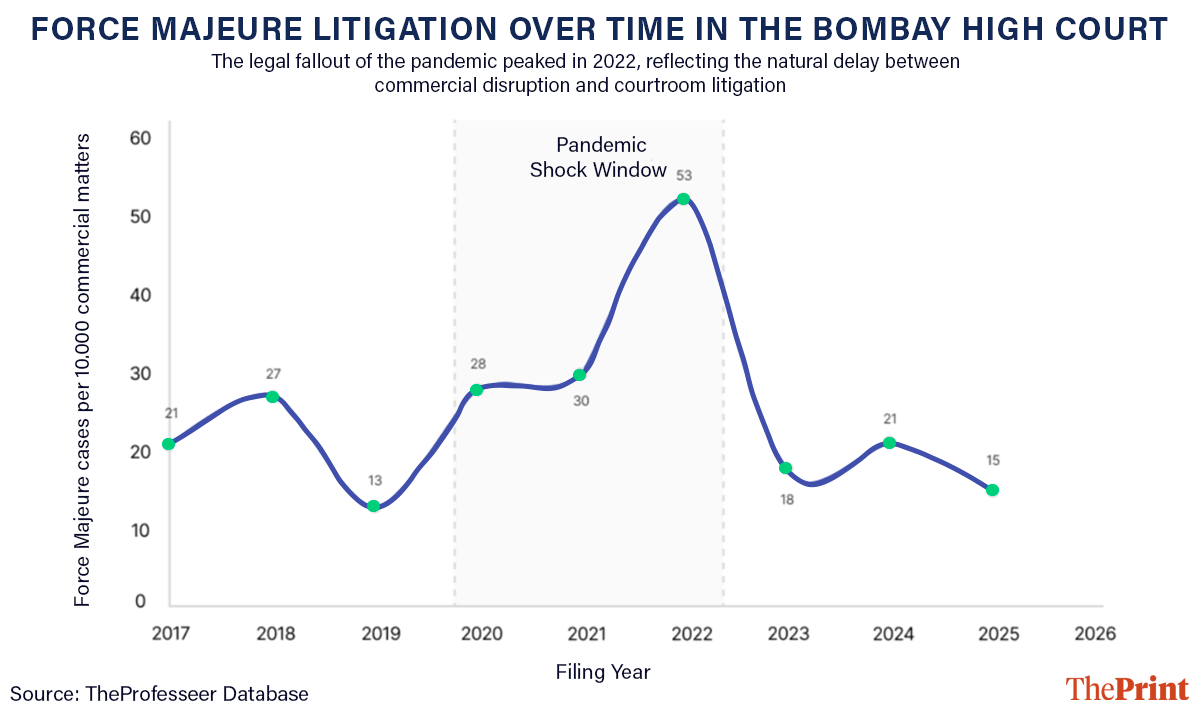 Take, for instance, the COVID-19 pandemic. The economic fallout was so significant that even the government of India issued procurement guidance treating pandemic-related disruptions as force majeure events. This trend is reflected in the data. In the Bombay High Court’s arbitration and commercial appellate dockets, FM disputes were relatively rare before 2020. However, as pandemic-era breakdowns moved from boardrooms to courtrooms, the rate rose sharply, peaking in 2022 at 53 cases per 10,000 matters. Some of these cases remain pending even today.