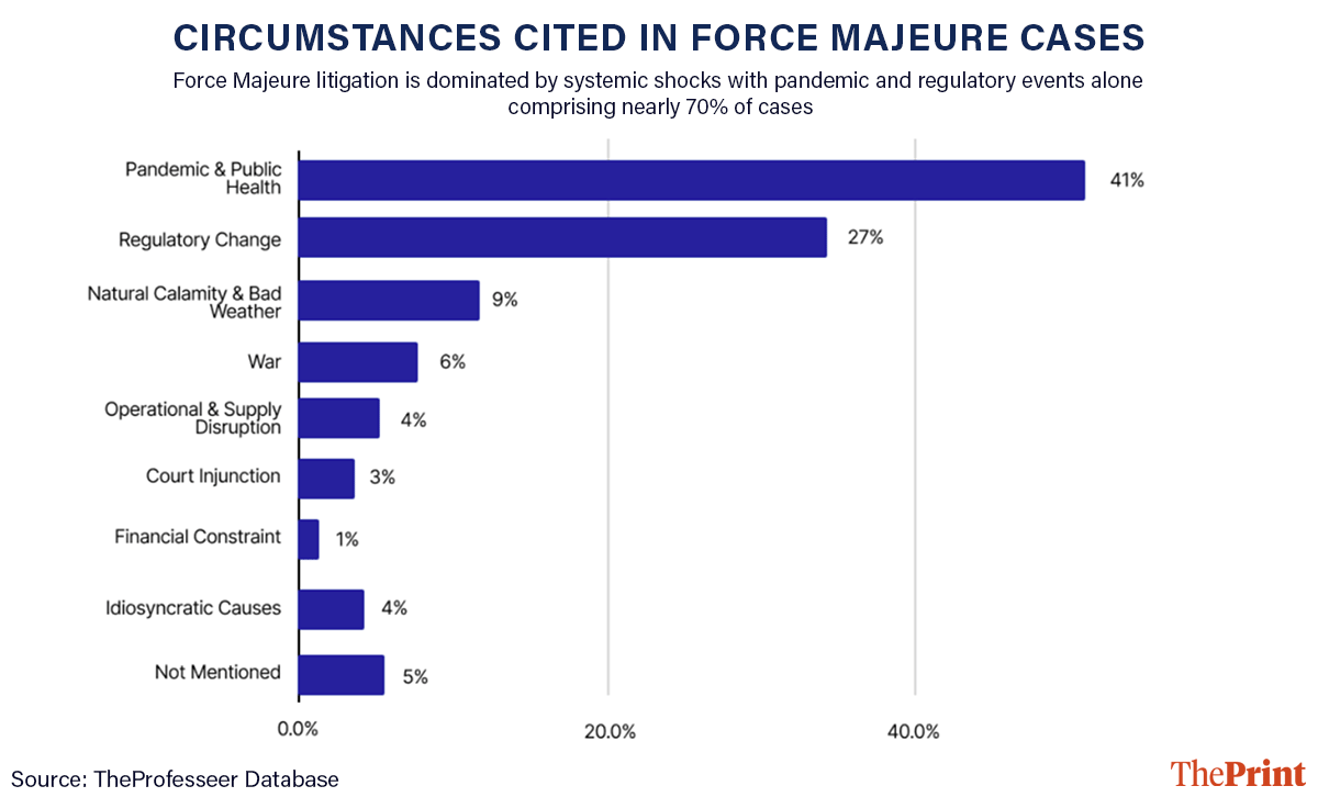 Force majeure originally comes from the Napoleonic Code, where it was meant specifically to cover events like natural disasters and wars. Evidence from three fora does not quite fit that original idea. “Acts of God” like these are surprisingly rare in the courtroom. Natural calamities and disruptive weather events account for less than 10 per cent of the cases we studied. Even war, which dominates current headlines and has spiked global risk indicators, historically accounts for just 6 per cent of invocations. Within that small subset, geopolitical shifts like the US withdrawal from Afghanistan and the Taliban takeover were cited in a third of the war-related pleas, while the Yemen crisis and the Russia-Ukraine war have surfaced in smaller numbers.