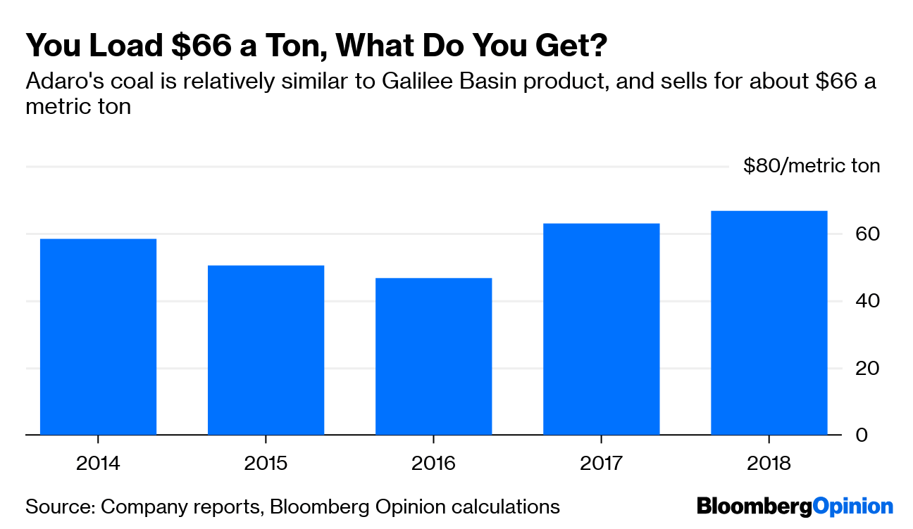 That’s roughly in line with the stuff sold by Indonesia’s PT Adaro Energy Tbk. At present, Adaro makes about $66 of revenue per metric ton of coal sold, a number pretty consistent with charts published in its investor materials. Put that together with the 10 million tons a year (mtpa) output from the first stage at Carmichael and you have something like $660 million of annual revenue.