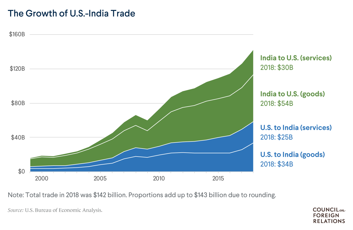 Trade between the United States and India has grown steadily ever since India’s economy began to take off in the mid-1990s and its information technology sector shot to prominence in the early 2000s. From 1999 to 2018, trade in goods and services between the two countries surged from $16 billion to $142 billion. India is now the United States’ eighth-largest trading partner in goods and services and is among the world’s largest economies. India’s trade with the United States now resembles, in terms of volume, U.S. trade with South Korea ($167 billion in 2018) or France ($129 billion).