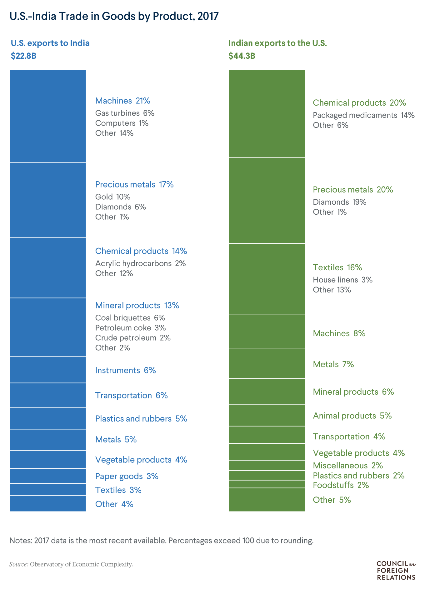 But as trade between Washington and New Delhi has increased, so too have tensions. U.S. and Indian officials have disagreed for years on tariffs and foreign investment limitations, but also on other complicated issues, particularly within agricultural trade. Concern for intellectual property rights has preoccupied the United States for thirty years, while issues concerning medical devices and the fast-growing digital economy have more recently emerged. On top of this, the Donald J. Trump administration has exacerbated tensions by creating new dilemmas, including a focus on bilateral trade deficits and the application of fresh tariffs, prompting retaliation from Prime Minister Narendra Modi’s government.