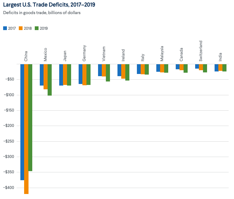 Bilateral trade deficits. Previously not a top U.S. trade concern, these became a major focus when Trump issued an executive order in 2017 requiring a study of the United States’ most significant trade deficits. India has slightly narrowed the trade deficit in goods with the United States, which went from $24.3 billion in 2016, the tenth-largest that year, to $23.3 billion in 2019, the eleventh-largest. Indian negotiators have proposed reducing the deficit via major purchases of products including liquefied natural gas and aircraft.