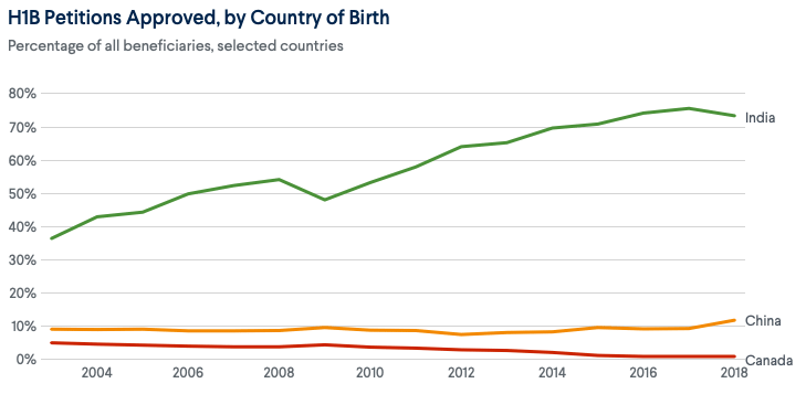 Due to its large pool of highly skilled workers, India is extremely competitive in services, and its professionals work around the world. Of the top ten companies [PDF] with H1B-approved petitions in 2018, four are Indian firms, three of which are at the very top. Over the past fifteen years, the proportion of approved H1B petitions from India went from just under 40 percent to more than 70 percent. India’s negotiating posture has long prioritized further opening other countries’ visa regimes for services workers; this was an unmet ambition, for example, of India’s in talks on the Regional Comprehensive Economic Partnership, a trade pact of fifteen countries, including China, that India opted out of after years of negotiations.