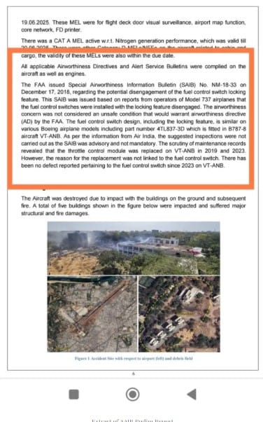 Another line from the report, viz. “there has been no defect reported pertaining to the fuel control switch since 2023 on VT-ANB” raises more questions than it answers. This line when read with reference to SAIB NM-18-33 of Dec 2018 reveals possible operation of fuel switch in an unintended manner since Air India had not complied with the SAIB. These switches also double up as engine start switches and are used only twice in a normal flight (one for starting, second for switching off at the ramp). Without acting on SAIB NM-18-33, did Boeing and Air India set up the “black swan” event of uncommanded or inadvertent operation of the two switches is something AAIB will have to probe deep into.