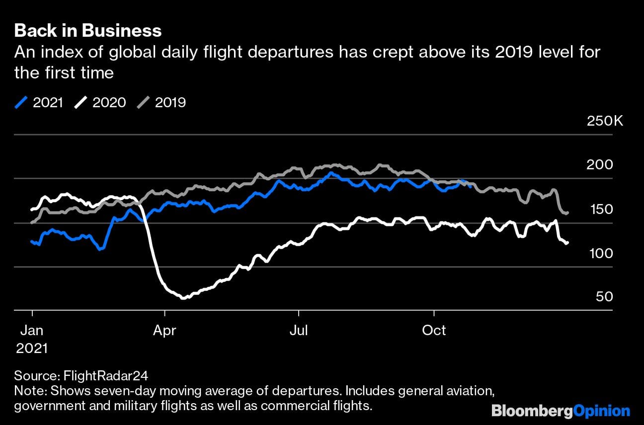Airlines still face immense challenges. Net debt is up by more than a third since the end of 2019 among 124 carriers tracked by Bloomberg, to $402 billion. Paying that off will require exceptional operating earnings, at a time when carriers are having to keep a lid on prices to tempt travelers back on board. Jet fuel, which accounts for about a quarter of costs, is close to a seven-year high.