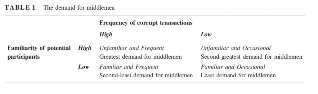 As a result, a middleman will be most relevant and valuable where transactions are frequent, but one party remains the same and the other, either briber or recipient, changes with each deal.