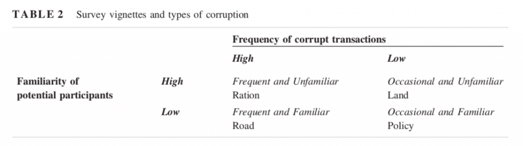 To examine the role of middlemen in different forms of corruption, I administered a survey experiment to a large sample of politicians and bureaucrats at nearly all levels of office in India – from village, block, and district elected councils, to state and national legislative constituencies. I asked respondents what portion of a bribe would be allocated to a range of different individuals, including middlemen, and varied the goal for which the bribe was being paid: acquiring a ration card, modifying a land record, acquiring a contract to build a road, or influencing an industrial policy.