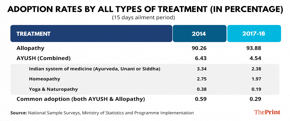 But available data shows that these initiatives have not changed the mindset of people. The National Sample Survey (NSS), conducted by the Ministry of Statistics and Programme Implementation, shows low adoption and acceptance of AYUSH systems by the majority of the population. This was observed in surveys conducted under the 71st round titled “Social Consumption: Health” in 2014 and the 75th round titled “Household Social Consumption: Health” survey in 2017-18.