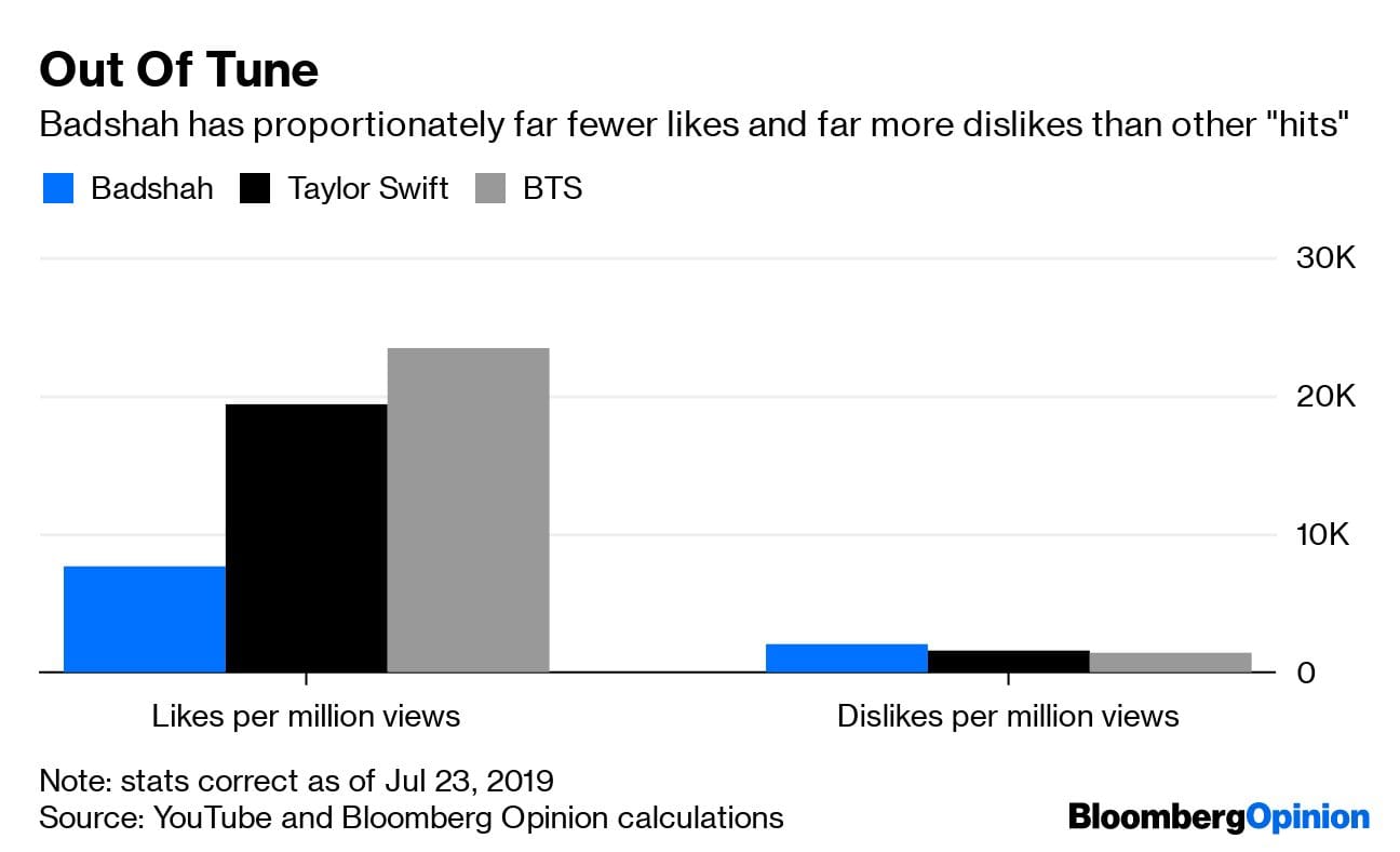 Does this shine a particularly bad light on Badshah and Sony Corp.’s Indian music arm? Not really. The system exists, and if they used it, they did so successfully and to their advantage. They wouldn’t be the first in the history of recorded music, or indeed of YouTube promotion. And once the view count hit a sizable level, the organic audience would start to pick up too. Sony Music India has 27 million followers of its own, but most of its videos have far fewer than one million views.