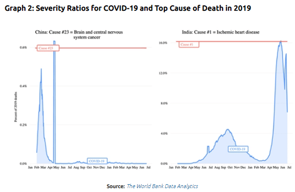 Comparative mortality burden from COVID-19 has shown a wide difference between India and China as well. Between January 2020 and September 2021, at the peak levels of daily reported COVID-19 deaths, COVID-19 mortality was comparable to the largest cause of death in India (Ischemic heart disease), and only the 23rd largest cause of death in China (Brain and central nervous system cancer), in a normal year. As represented in Graph 2, COVID-19 severity ratios express COVID-19 deaths in 2020-2021 in relation to deaths from all causes in 2019 as a 7-day average. According to the methodology, top-cause severity ratio(s) show cause-specific deaths in 2019 in relation to deaths from all causes in 2019 as a yearly average.