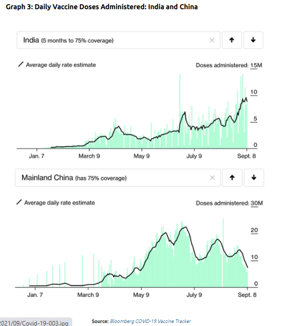 Scaling up of vaccine supplies was to be a key determinant of how fast a country could get back to normal. Even though it was the biggest vaccine manufacturer in the world pre-pandemic, India failed to scale up in time, whereas China increased vaccine production multifold over months, reflected in the mammoth vaccine coverage it has achieved within the country as well as abroad with its aggressive vaccine diplomacy efforts. As of 7th September, India constituting 17.7 percent of the world population has conducted 12.7 percent of the world’s COVID-19 vaccinations, while China with 18.2 percent of the world population has conducted a vastly higher 37.7 percent of vaccinations. India has had a slow start with vaccination and has neared a daily vaccination rate of 10 million only in September, while China had reached 10 million a day levels many months back (Graph 3). With India managing to overcome manufacturing bottlenecks, its path towards vaccinating all adults this year must have become easier. Interestingly, despite the infodemic around vaccines, an interview-based survey of young adults across 15 countries between August 31-September 6 showed that India along with China are the highest ranked in terms of vaccine confidence in the world.